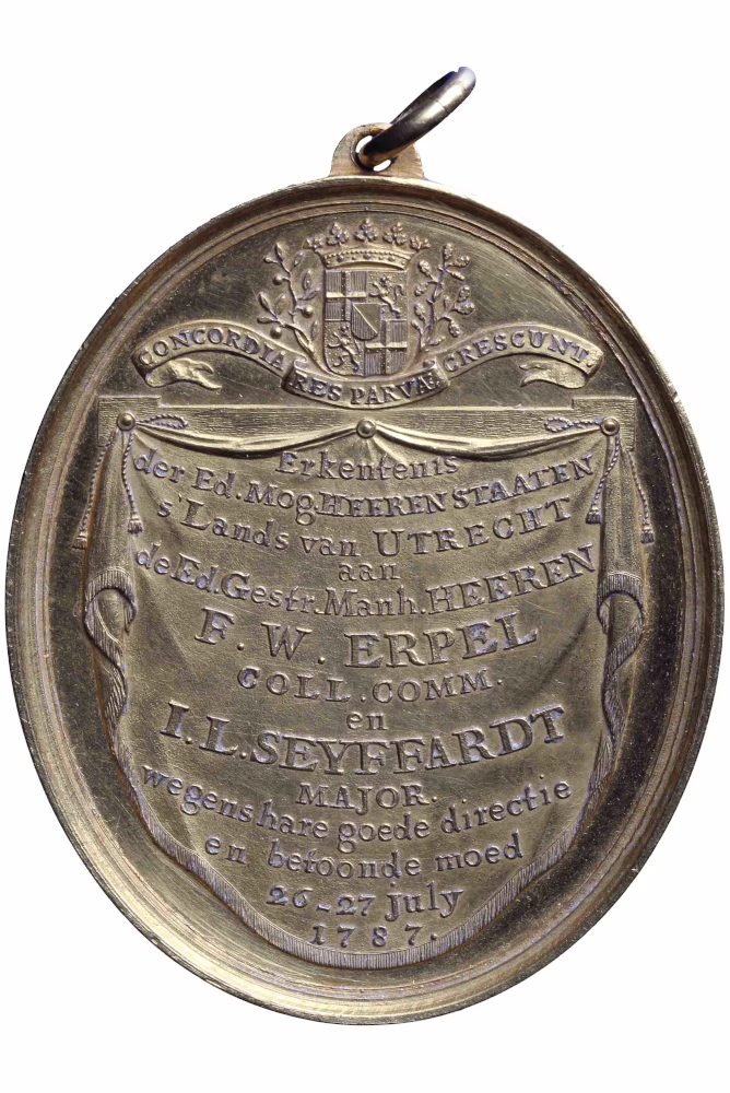 | Opschriften | voorzijde, omschrift: SOESTDYK manhaftig verdedigd door een DETACHEMENT van ’t REGIM(ent) van HESSEN DARMSTAD; opschrift op voetstuk: T’ GEWELD / BETEUGELD; keerzijde: Gedachtenis der Ed. Mog. HEEREN STAATEN s’ Lands van UTRECHT aan de Ed. Gestr. Manh. HEEREN F.W. ERPEL COLL. COMM. en I.L. SEYFFARDT MAJOR. wegens hare goede directie en betoonde moed 26-27 july 1787.; opschrift op wimpel: CONCORDIA RES PARVÆ CRESCUNT. |