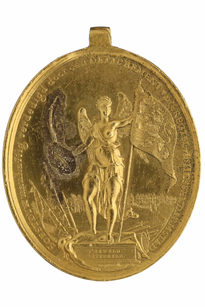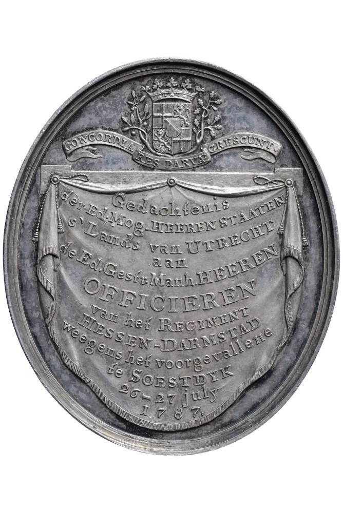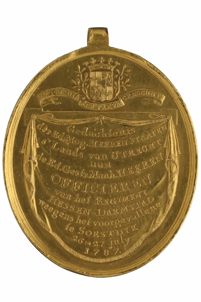 De Beloningspenning van Soestdijk, zilver, 1787 werd uitgereikt in goud aan de officieren van het regiment Hessen-Darmstadt voor het afslaan van een patriotse aanslag op Paleis Soestdijk.