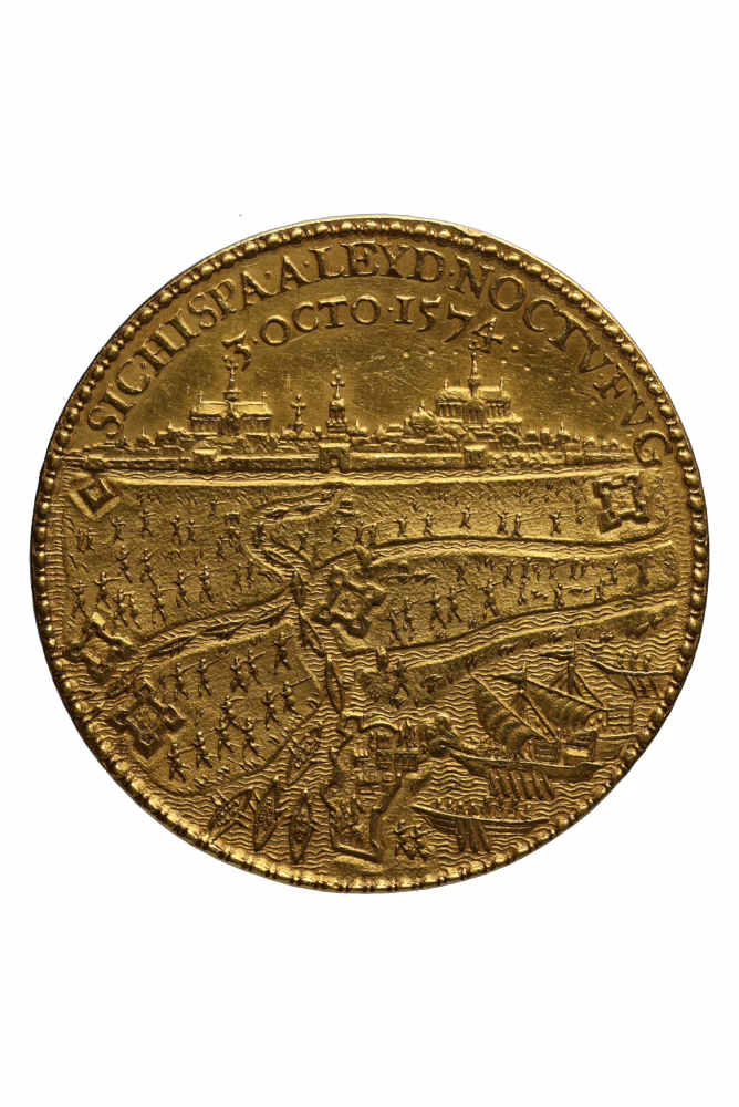 | (Historische) context | Van 26 mei tot 3 oktober 1574 belegerden Spaanse troepen de stad Leiden. Al snel brak in de stad hongersnood en pest uit; duizenden inwoners van de stad lieten het leven. Begin augustus werden de dijken langs de Maas en de Hollandse IJssel op verschillende plaatsen doorgestoken. Het duurde nog tot begin oktober voordat het water hoog genoeg was voor de ontzettingsvloot om Leiden te bereiken. In de jaren negentig van de 16de eeuw bestelden de Staten-Generaal, de Staten van Holland en de universiteit van Leiden exemplaren van de beloningspenning op het Ontzet van Leiden, die zij als beloningen uitreikten. |