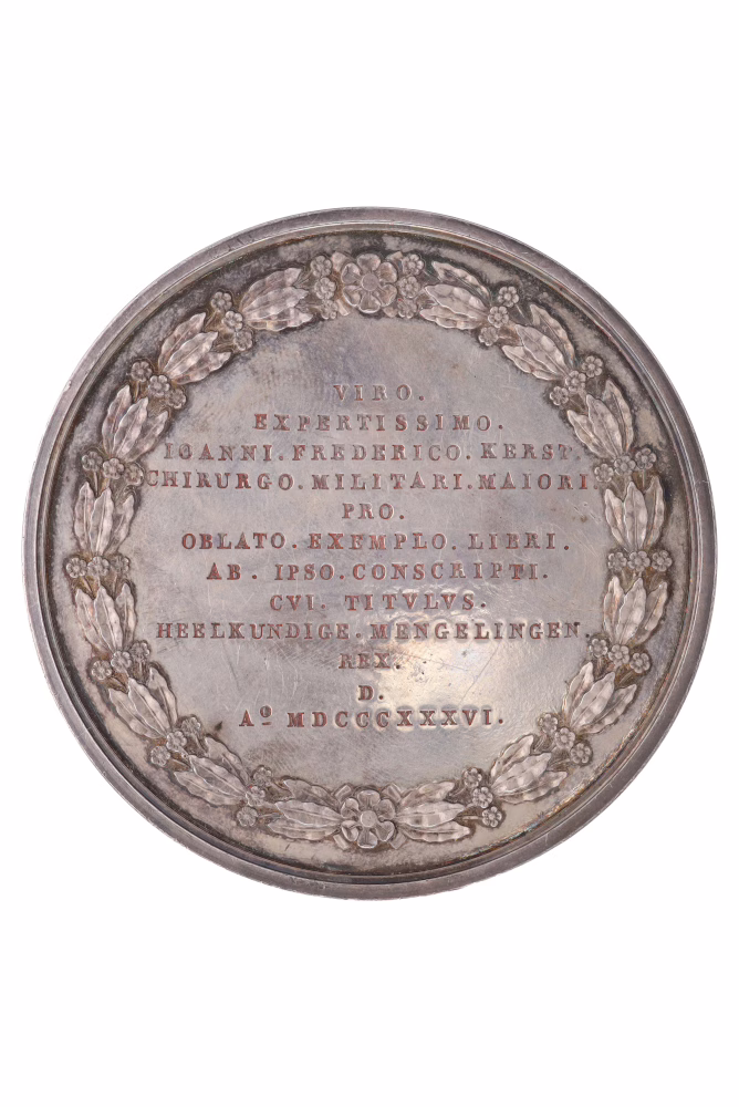 | Opmerking | De Erepenning voor Blijken van Belangstelling in ’s Rijksverzamelingen door Schenking Betoond is de voorloper van de Erepenning voor Verdienste jegens Openbare Verzamelingen. Deze wordt meestal aangeduid als Museummedaille. De penning werd uitgereikt in twee klassen: goud en zilver. De gouden penningen werden uitgereikt in drie verschillende formaten: met een diameter van 67 mm (voor een gouden medaille met een waarde van 100 dukaten), 51 mm (50 dukaten) en 41 mm (25 dukaten). Vanaf 1837 werden op de stempels van 51 en 41 mm ook penningen geslagen met een waarde van respectievelijk 25 en 10 dukaten. Zilveren penningen werden alleen geslagen op de stempels van 67 mm. In 1823 werden voor alle formaten ook voorzijdestempels gesneden met het Nederlandstalige omschrift: WILLEM KONING DER NEDERL. G.H.V. LUXEMB. Vanaf dat moment lijken de stempels met Latijns omschrift te zijn gebruikt voor schenkingen met een wetenschappelijk karakter en de Nederlandstalige voor andersoortige schenkingen. Op de keerzijde werd een opschrift gegraveerd met daarin de naam van de ontvanger van de medaille en de reden van verlening. |