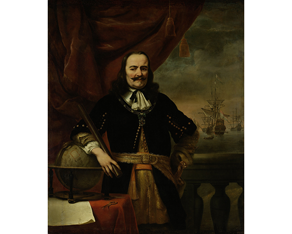 Zelfverzekerd kijkt hij ons aan. Linkerhand in de zij, in de rechter een commandostaf. En in de achtergrond zijn vlaggeschip de Zeven Provinciën. Michiel de Ruyter is de beroemdste zeeheld uit de Nederlandse geschiedenis. Om zijn hals draagt hij een ketting. Een ketting van een Franse ridderorde.